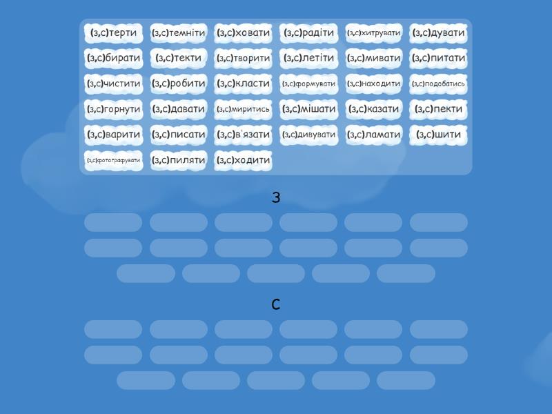 З: (з,с)горнути, (з,с)робити, (з,с)в’язати, (з,с)ламати , (з,с)варити, (з,с)бирати, (з,с)давати, (з,с)дивувати, (з,с)чистити, (з,с)шити, (з,с)мішати, (з,с)миритись, (з,с)летіти, (з,с)радіти, (з,с)мивати, (з,с)находити, (з,с)дувати, С: (з,с)класти, (з,с)творити, (з,с)питати, (з,с)формувати, (з,с)терти, (з,с)хитрувати, (з,с)фотографувати, (з,с)ховати, (з,с)ходити, (з,с)писати, (з,с)пекти, (з,с)подобатись, (з,с)пиляти, (з,с)казати, (з,с)текти, (з,с)темніти,