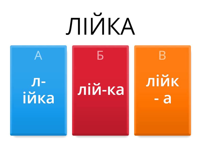 1) ЛІЙКА a) л- ійка b) лій-ка c) лійк - а 2) ХОДЖУ a) хо-джу b) ход-жу c) х-оджу 3) Майонез a) Май-онез b) Майо-нез 4) МАР'ЯНКА a) Мар' - янка b) Мар - 'янка c) М - ар'янка 5) ЧАЙНИК a) ча - йник b) чайн -ик c) чай -ник 6) КУКУРУДЗА a) к- укурудза b) кукуру - дза c) кукуруд - за 7) СИЛЬНИЙ a) сил -ьний b) силь-ний c) с - ильний 8) МАЛЮЄ a) мал - ює b) малю- є c) ма - лює 9) ПОЛЬОВИЙ a) польо-вий b) поль-овий 10) Слово СНІГ - неможливо перенести a) ні b) так 11) Слово ЗИМА - можна поділити для переносу a) так b) ні 12) Ґудзик a) ґу-дзик b) ґуд-зик