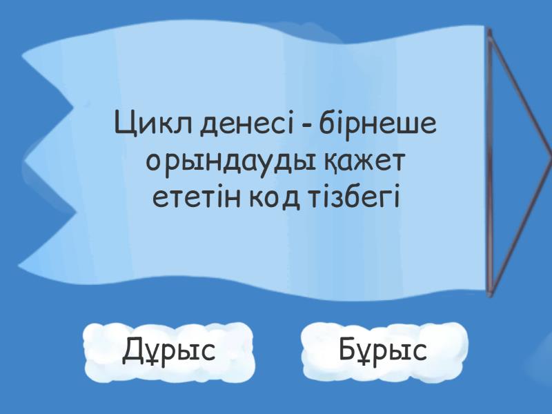Дұрыс: Цикл денесі - бірнеше орындауды қажет ететін код тізбегі, While операторын әдетте, циклдің қайталану саны алдын ала белгісіз болған жағдайда қолданылады. , Берілген программалық кодта цикл денесі 5 рет орындалады. , Бұрыс: While операторы - параметрлі цикл деп атайды., Цикл дегеніміз - белгілі бір мақсатқа жету барысында орындалатын реттелген іс-әрекеттер тізбегі., Python тілінде үш цикл операторы бар., While операторында шарт жалған болғанда цикл денесі орындалады., For операторы - шартты алдын ала тексеретін цикл.,