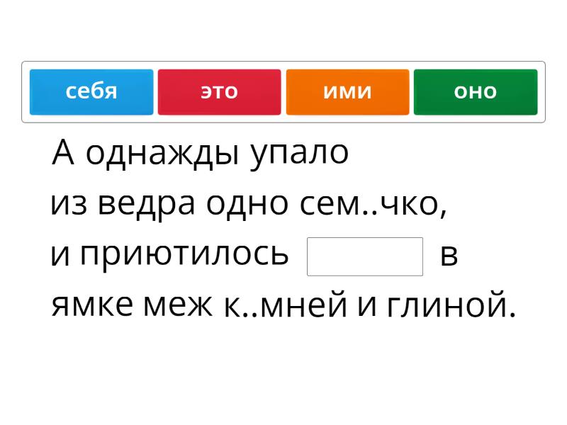 А однажды упало из ведра одно сем..чко, и приютилось ____ в ямке меж к..мней и глиной. Долго томилось ____ семечко, а потом нап..талось росой, распалось, выпустило из себя тонкие в..лоски к..решка, вп..лось ____ в к..мень и глину и стало расти. Так нач..л жить на свете ____ маленький цветок. Ему было ____ питаться в камне и глине; капли дождя, упавшие с неба сходили по верху земли и не прон..кали до ____ корня, а цветок ____ жил и жил и рос пом..леньку.