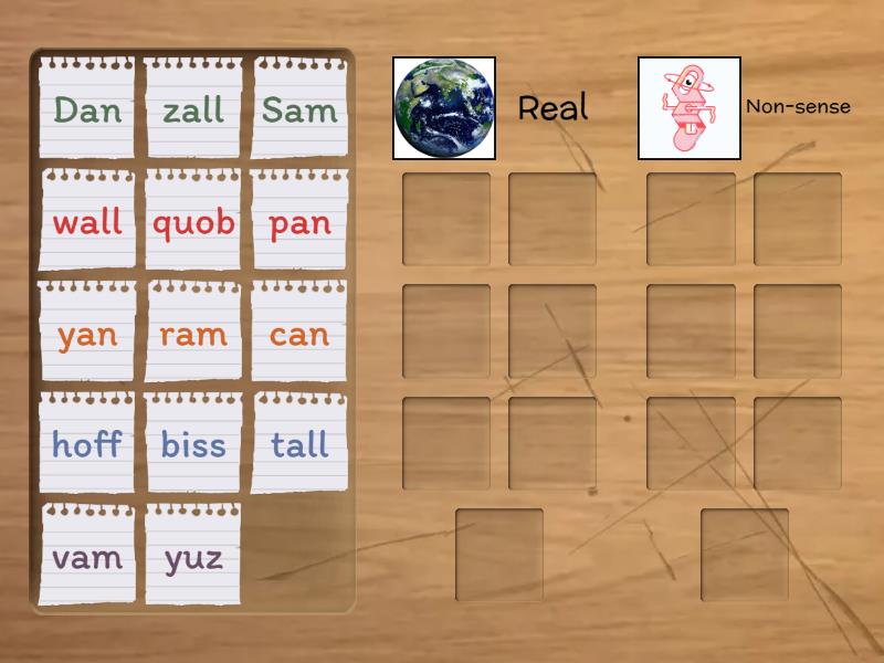 Real: can, pan, ram, Sam, Dan, wall, tall, Non-sense: quob, vam, hoff, biss, zall, yan, yuz,