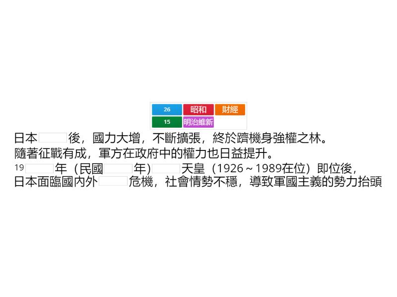 日本____後,國力大增,不斷擴張,終於躋機身強權之林。 隨著征戰有成,軍方在政府中的權力也日益提升。 19____年(民國____年)____天皇(1926~1989在位)即位後, 日本面臨國內外____危機,社會情勢不穩,導致軍國主義的勢力抬頭 民國____年9月18日,日軍在____藉故發動____事變,進而占領中國東北。 民國____年1月28日,日軍又進攻____,是為____事變。 不久,日本在東北扶植____成立「____國」, 又策動____各省「自治」,企圖分裂國民政府 國民政府最初採取____政策,加緊圍剿____。 但民間反日情緒升高,中共趁勢宣傳全國團結抗日,爭取各界同情。 民國____年,在____西安負責剿共的____挾持蔣中正, 要求「____」,史稱____事變