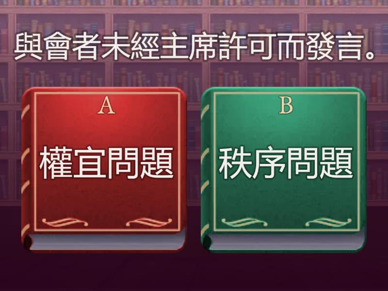 1) 議場外傳來噪音,干擾與會者發言。 a) 權宜問題 b) 秩序問題 2) 議場發生地震、停電等緊急狀況。 a) 權宜問題 b) 秩序問題 3) 議場發生喧擾,妨礙出席人之聽覺。 a) 權宜問題 b) 秩序問題 4) 議場發生設備故障,無法進行會議。 a) 權宜問題 b) 秩序問題 5) 發言人發言偏離議題範圍。 a) 權宜問題 b) 秩序問題 6) 與會者未經主席許可而發言。 a) 權宜問題 b) 秩序問題 7) 主席未依序排定發言次序。 a) 權宜問題 b) 秩序問題 8) 主席未經表決定自通過議案。 a) 權宜問題 b) 秩序問題 9) 開會前以書面呈現,並經1人以上附署 a) 提案 b) 動議 10) 開會中以口頭提出,並經1人以上附議 a) 提案 b) 動議