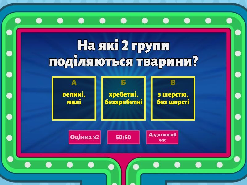 1) На які 2 групи поділяються тварини? a) великі, малі b) хребетні, безхребетні c) з шерстю, без шерсті 2) Які тварини належать до хребетних? a) риби, птахи, звірі b) комахи, оси, комарі c) павуки, черви, хрущі 3) Які тварини належать до безхребетних? a) вовк, лисиця, заєць b) щука, орел, ластівка c) комахи, павукоподібні, ракоподібні 4) На які 3 групи поділяються рослини? a) дерева, кущі, трав'янисті рослини b) хвойні, листяні, колючі c) польові, декоративні, кольорові 5) До кущів належить: a) тюльпан, калина, сон-трава b) бузок, смородина, малина c) агрус, чорнобривці,чорниця 6) Як називається гра, що за легендою майстер розбив квадратну керамічну плитку? a) Тангрим b) Торун c) Танграм