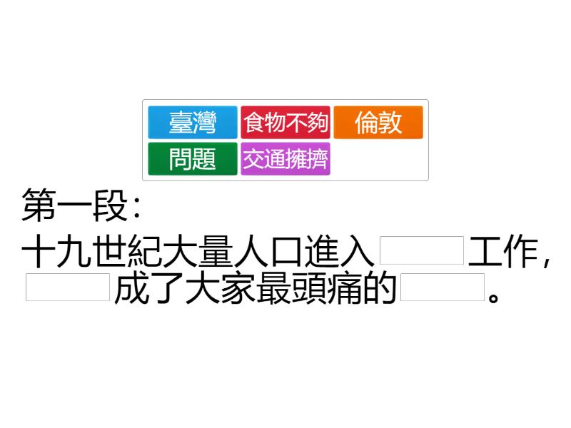 第一段: 十九世紀大量人口進入____工作, ____成了大家最頭痛的____。 第二段: ____想幫大家改善____問題, 卻一直想不到____。 第三段: 皮爾森想學____在地下____, 讓____地下化。 第四段: 議員們提出很多____, 後來皮爾森不斷____, ____終於接受他的建議。 第五段: ____建設讓倫敦的____問題得到改善, 也成為____的重要特色之一。 十九世紀____進入倫敦工作, ____成為大家頭痛的問題。 ____,想改善交通問題, 便學田鼠____,讓鐵路地下化。 世界第一條____完工後,交通問題得到改善, 地鐵建設也成為____。