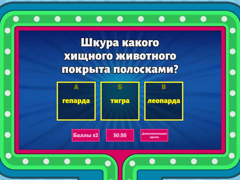 1) Шкура какого хищного животного покрыта полосками? a) гепарда b) тигра c) леопарда 2) Рог нужен носорогу, чтобы a) закапываться в земле b) чесать себя c) нападать на врагов 3) Зебра имеет разные полосы на шкуре, потому что: a) это смесь чёрной и белой лошади b) это хорошая маскировочная окраска c) она просто измазалась черной и белой краской 4) Через какое время после своего появления на свет детеныши зебры начинают ходить? a) через час b) через неделю c) через месяц 5) Из чего, по-вашему изготовлен термитник: a) из грибов b) из мха c) из грязи 6) Большой пушистый хвост муравьеда нужен: a) как защита от холода b) подметать его нору c) скрываться им в случае опасности 7) Что слон не делает своим хоботом? a) всасывает воду b) дышит c) захватывает пищу d) свистит e) поглаживает своих друзей 8) Правда ли, что самым опасным врагом гигантского муравьеда считается лев? a) правда b) неправда 9) Правда ли, что некоторые животные чистят свою шкуру, валяясь в грязи? a) правда b) неправда 10) Правда ли ,что «королева» термитников превосходит кости в сотни раз ? a) правда b) неправда