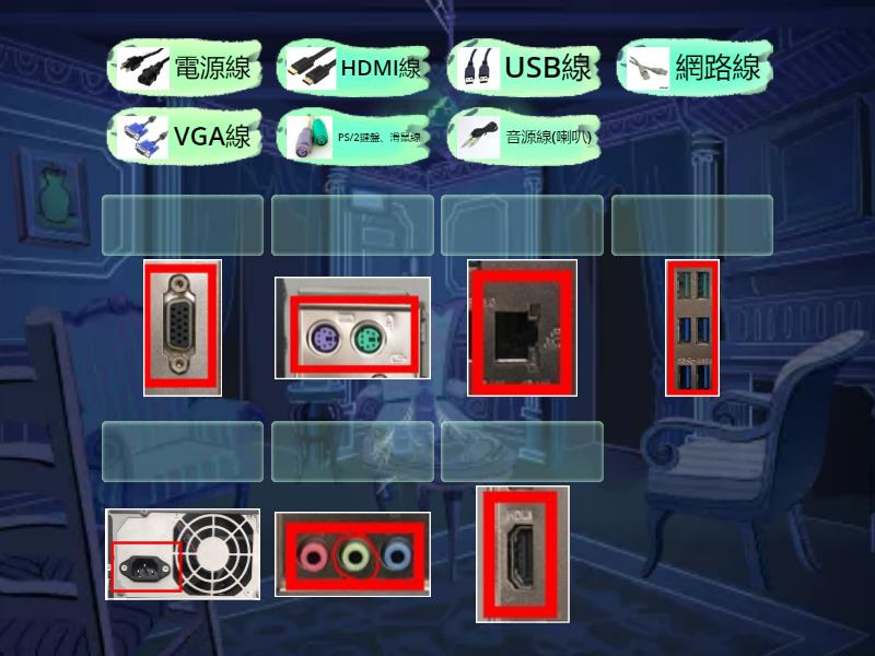 HDMI線, USB線, 電源線, 音源線(喇叭), PS/2鍵盤、滑鼠線, 網路線, VGA線,