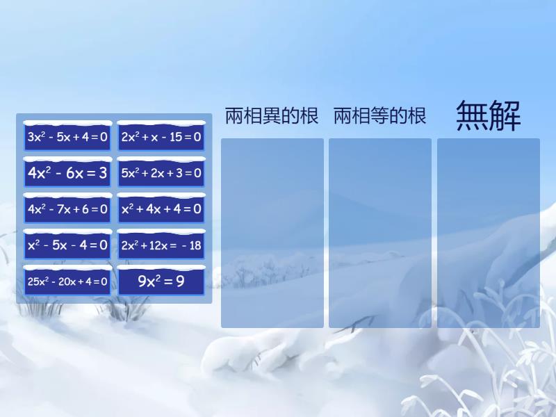 兩相異的根: x2-5x-4=0, 4x2-6x=3, 2x2+x-15=0, 9x2=9, 兩相等的根: 2x2+12x=-18, 25x2-20x+4=0, x2+4x+4=0, 無解: 5x2+2x+3=0, 4x2-7x+6=0, 3x2-5x+4=0,