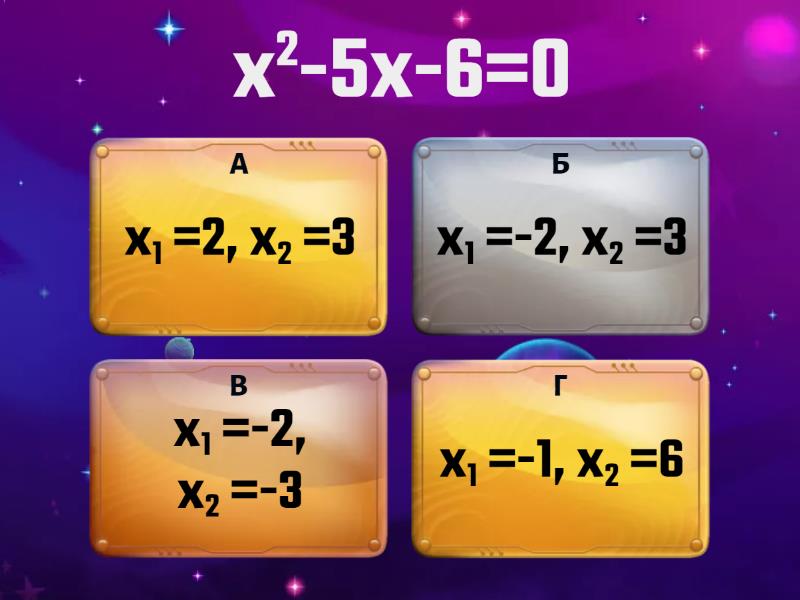 1) х2-5х+6=0 a) х1 =2, х2 =3 b) х1 =-2, х2 =3 c) х1 =-2, х2 =-3 d) х1 =5, х2 =6 2) х2-5х-6=0 a) х1 =2, х2 =3 b) х1 =-2, х2 =3 c) х1 =-2, х2 =-3 d) х1 =-1, х2 =6 3) х2+6х+8=0 a) х1 =-2, х2 =3 b) х1 =-2, х2 =-4 c) х1 =2, х2 =-3 d) х1 =-2, х2 =-3 e) х1 =7, х2 =3 f) х1 =9, х2 =3