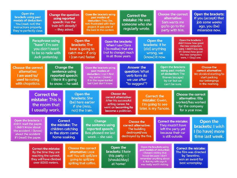 Open the brackets: If you (accept) that job some weeks ago, you (be) miserable now. - If you had accepted that job some weeks ago, you would be miserable now., Open the brackets: I didn't know how good the new computers were. I didn't buy one. If I (know) how good the new computers were, I I (buy) one. - I didn't know how good the new computers were. I didn't buy one. If I had known how good the new computers were, I would have bought one., Open the brackets: She (be) here earlier if she (miss, not) the train. - She would have been here earlier if she hadn't missed the train., Open the brackets: If he (did) anything wrong, we (know) it now. - If he had done anything wrong, we would know it now., Open the brackets: I didn't read the paper. I didn't know about the accident. I (know) about the accident if I (read) the paper. - I didn't read the paper. I didn't know about the accident. I would have known about the accident if I had read the paper., Open the brackets using past modals of deduction: I (forget) visiting that house because I don't remember anything about it. But my wife says it was really worth visiting. - I must have forgotten visiting that house because I don't remember anything about it. But my wife says it was really worth visiting., Open the brackets using past modals of deduction: They (be, not) frustrated with their project. It was one of the best in the contest. - They can't/couldn't have been frustrated with their project. It was one of the best in the contest. , Open the brackets using past modals of deduction: The thieves (escape) by car but we can’t be sure. - The thieves might/may/could have escaped by car but we can’t be sure., Open the brackets using past modals of deduction: I can’t find my purse. I (leave) it in the supermarket but I just don’t know. - I can’t find my purse. I could/might/may have left it in the supermarket but I just don’t know., Open the brackets using past modals of deduction: You (read, not) the instructions properly. They’re perfectly clear. - You can’t/couldn't have read the instructions properly. They’re perfectly clear., Correct the mistake: He was someone who she regularly wrote. - He was someone to whom she regularly wrote., Correct the mistake: This is the room that I usually work. - This is the room where I usually work., Correct the mistake: Gwen, I’m going to see later, is my fiancée. - Gwen, who OR whom I’m going to see later, is my fiancée., Choose the correct alternative: We decided starting/to start packing our belongings in the morning. - We decided to start packing our belongings in the morning., Choose the correct alternative: Sam wants me go/to go to the party with him. - Sam wants me to go to the party with him., Open the brackets: I wish I (to have) more time last week. - I wish I had had more time last week., Open the brackets: I hate this party – I (should/stay) at home! - I hate this party – I should have stayed at home!, Open the brackets: The bear is going to catch me – if only I (can run) faster. - The bear is going to catch me – if only I could run faster., Choose the correct alternative: The building destroyed/was destroyed by the fire. - The building was destroyed by the fire., Choose the correct alternative: Ella worked/has worked for the company for a year now. - Ella has worked for the company for a year now., Choose the correct alternative: I am used to/ used to eating with chopsticks. - I am used to eating with chopsticks, Change the question using reported speech: Has the train left already? – they asked. - They asked/wanted to know/... if/whether the train had a lready left., Change the sentence using reported speech: I think it’s going to snow. – he said. - He said/thought/... (that) it was going to snow., Change the sentence using reported speech: Ben phoned me last week. – she said. - She said to me/told me/... (that) Ben had phoned her the week before., Correct the mistake: The children catching in the storm came home soaking. - The children caught in the storm came home soaking., Correct the mistake: The film was directed by Tarantino, won an award for best screenplay. - The film directed by Tarantino won an award for best screen play., Choose the correct alternative: After his successful acting career, he went on becoming/to become a politician. - ...he went on to become a politician., Choose the correct alternative: Look out! You will spill/are going to spill/are spilling that coffee. - You are going to spill that coffee., Open the brackets: When I saw Clara I (to realise) that she (not to change) much in all those years. - When I saw Clara I realised that she hadn't changed much in all those years., Correct the mistake: By the time they are reaching the summit, they will have climbed over 8000 meters. - By the time they reach the summit, they will have climbed over 8000 meters., Correct the mistake: They mustn't have left the party yet because their car is still outside. - They can’t/couldn't have left the party yet because their car is still outside., Paraphrase using "have": I’m sure you didn’t need to be so rude with Jack yesterday. - You shouldn't have been so rude with Jack., Answer the question: What verb form do we use after "to suggest"? - suggest DOING or suggest THAT WE DO (no object after "suggest"),