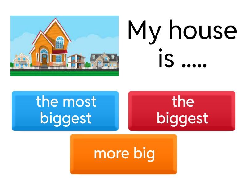 1) My house is ..... a) the most biggest b) the biggest c) more big 2) My car is ............. a) the fastest. b) fasterest c) most fastest 3) I am .................. than you. a) the tallest b) tall c) taller 4) I think she is the .................... actress. a) beautiful b) most beautiful c) beautifuler 5) This sofa is ..................... than a chair. a) comfortablerer b) more comfortable c) the most comfortable 6) Homer is ................. than I am. a) happy b) happier c) the most happy 7) He is ......................... man in the world. a) the shortest b) shorter c) most shortest 8) This dog runs .............. in the village. a) faster b) the most fast c) the fastest 9) This book is ....................... than a magazine. a) most interesting b) more interesting c) interestinger 10) My pencil is ........ than his. a) cheap b) more cheaper c) cheaper 11) I drive ........ than Tom. a) the more careful b) more carefully c) carefullier 12) Who is the........ in your family? a) smart b) smarter c) smartest 13) I think Sonic is the...character in the movie. a) more amazing b) most amazing c) amazingest 14) I think Iron man is the ... superhero in Avangers. a) most cool b) coolest c) cooler 15) I think J.K. Rowling is the ... writer in the world. a) famousest b) more famous c) most famous 16) Quincy is the ... person in our class. a) friendly b) friendliest c) more friendly 17) I think kittens are the .... animals in the world. a) most cute b) cutest c) cute 18) Yoyo is the ... child in the school. Everyone knows him and likes him. a) popular b) most popular c) more popular 19) Who is .......... ? Allen or Andy? a) tallest b) taller c) more taller 20) Could you walk .......... ? I can't catch you. a) more slowly b) slower c) slowlier
