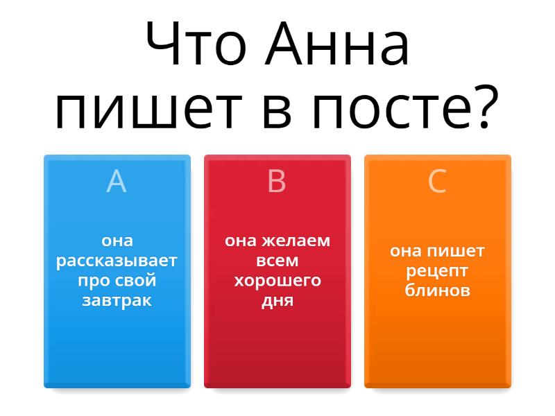 1) Что Анна пишет в посте? a) она рассказывает про свой завтрак b) она желаем всем хорошего дня c) она пишет рецепт блинов 2) Какой кофе пьёт Анна? a) чёрный с молоком и сахаром b) чёрный с молоком, но без сахара c) чёрным без молока и без сахара 3) Что она ест на завтрак? a) кашу b) блины с вареньем c) кофе d) ягоды e) мюсли f) чай 4) Какая погода на улице? a) холодно b) тепло c) светит солнце d) идёт снег 5) Что в сумке у Анны? a) зарядка b) кошелёк c) наушники d) йогурт e) паспорт f) крем для рук 6) Что Анна любит делать перед лекциями? a) общаться с подругами b) повторять домашнее задание c) пить кофе d) читать книги 7) Какого русского писателя студенты изучают на лекции? a) Достоевского b) Лермонтова c) Пушкина d) Толстого 8) На каком факультете учится Анна? a) факультет иностранных языков b) факультет физики и математики c) филологический факультет 9) Что Анна покупает на обед? a) свинину и рис b) суп c) курицу и рис d) чёрный чай e) салат f) компот 10) Почему Анна не ужинает? a) Она на диете b) Она не любит готовить c) У неё нет аппетита