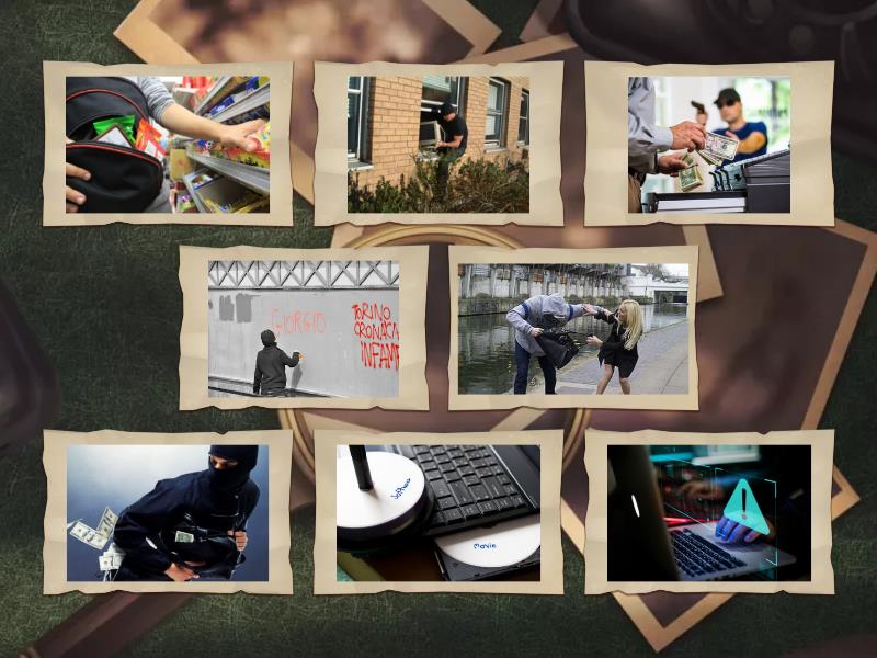 burglary, fraud, mugging, piracy, robbery, shoplifting, theft, vandalism,