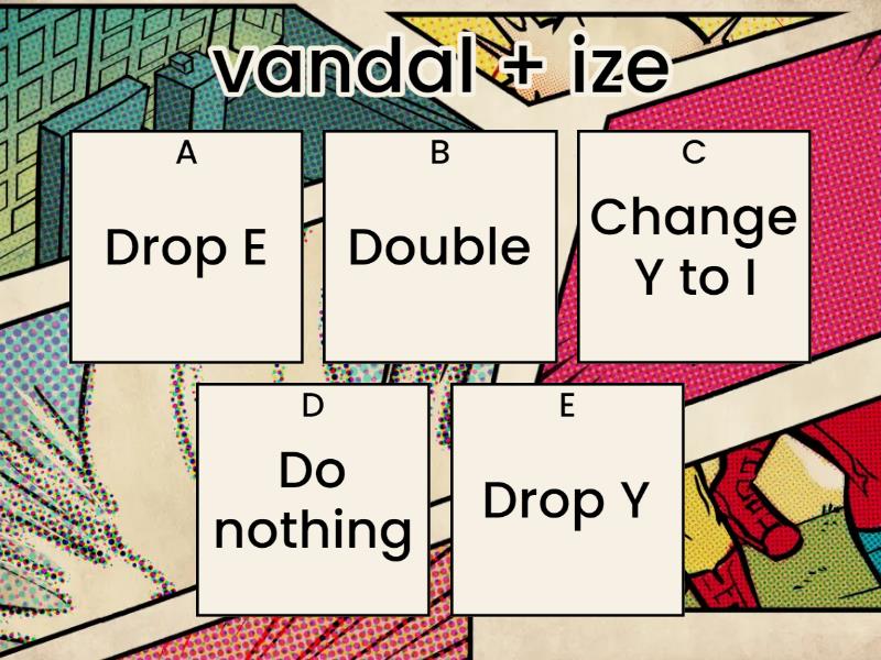 1) vandal + ize a) Drop E b) Double c) Change Y to I d) Do nothing e) Drop Y 2) fame + ous a) Drop E b) Double c) Change Y to I d) Do nothing e) Drop Y 3) outrage + ous a) Drop E b) Double c) Change Y to I d) Do nothing e) Drop Y 4) envy + ous a) Drop E b) Double c) Change Y to I d) Do nothing e) Drop Y 5) agony + ize a) Drop E b) Double c) Change Y to I d) Do nothing e) Drop Y 6) continue + ous a) Drop E b) Double c) Change Y to I d) Do nothing e) Drop Y 7) coast + al a) Drop E b) Double c) Change Y to I d) Do nothing e) Drop Y 8) option + al a) Drop E b) Double c) Change Y to I d) Do nothing e) Drop Y 9) specify + ic a) Drop E b) Double c) Change Y to I d) Do nothing e) Drop Y 10) propose + al a) Drop E b) Double c) Change Y to I d) Do nothing e) Drop Y 11) deny + al a) Drop E b) Double c) Change Y to I d) Do nothing e) Drop Y 12) globe + al a) Drop E b) Double c) Change Y to I d) Do nothing e) Drop Y 13) civil + ize a) Drop E b) Double c) Change Y to I d) Do nothing e) Drop Y 14) value + able a) Drop E b) Double c) Change Y to I d) Do nothing e) Drop Y 15) apology + ize a) Drop E b) Double c) Change Y to I d) Do nothing e) Drop Y 16) vocal + ize a) Drop E b) Double c) Change Y to I d) Do nothing e) Drop Y 17) glue + ing a) Drop E b) Double c) Change Y to I d) Do nothing e) Drop Y