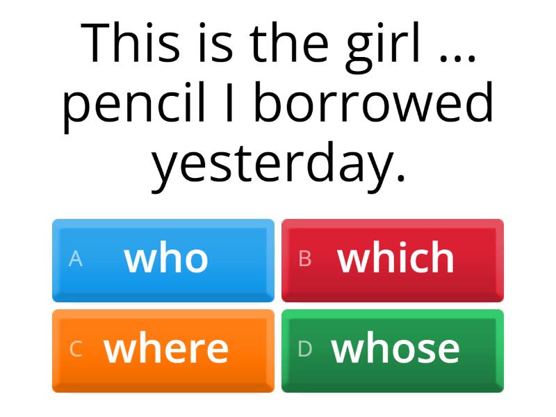 1) This is the girl ... pencil I borrowed yesterday. a) who b) which c) where d) whose 2) I've just seen a cat ... my sister feeds every evening. a) who b) which c) where d) whose 3) A teacer is a person ... helps you to understand a school subject. a) who b) which c) where d) whose 4) That was the school ... Emily and Linda were studying at. a) where b) which c) that d) who 5) A cat is an animal ... doesn't like being controlled. a) who b) which c) where d) whose 6) Candis is the boss ... will always help you. a) who b) which c) where d) whose 7) It was the room ... Mike and Jane were studying. a) who b) which c) where d) whose 8) Informal: Billy is the boy ... I go to school with. a) who b) which c) that d) where 9) Formal: I saw the woman about ... I was talking about. a) that b) whose c) who d) whom 10) Formal: This is the place ... you should arrive a) in which b) at where c) to which d) which