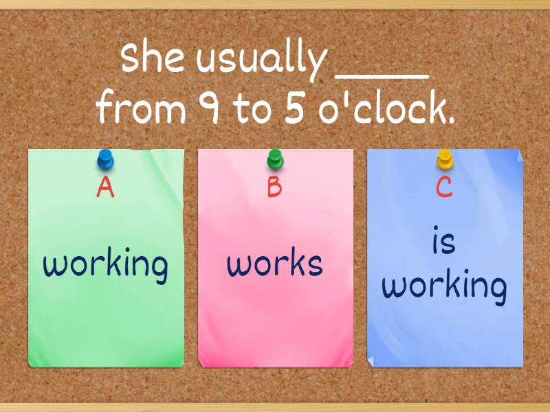 1) She usually ____ from 9 to 5 o'clock. a) working b) works c) is working 2) ___ Ann play tennis? a) Do b) Is c) Does 3) She ______ talk very much. a) isn't b) don't c) doesn't 4) I_______ TV at the moment. a) wathcing b) watches c) 'm watching 5) My parents ________ dinner now. a) have b) has c) 're having 6) My friend ________ two languages - Spanish and French. a) speak b) speaks c) speaking 7) We are on holiday now and________ in a beautiful hotel! a) staying b) saty c) stays 8) I can't speak now, I __________the car. a) drives b) am driving c) driving 9) I almost never ________ things from the internet. a) buy b) 'm buying c) buys 10) We sometimes ________ movies at the cinema. a) watches b) are watching c) watch 11) _____ you like eating out? a) Are b) Do c) Does 12) I _______ like bowling. a) 'm not b) don't c) aren't 13) What ___ she usually wear? a) does b) do c) is 14) When ____your birthday? a) are b) is c) am 15) Where ____ you live? a) is b) does c) do 16) - Hi! What _____you_____now? a) are / doing? b) is / doing c) do / do? 17) What ______you _______ at weekends? a) do / doing b) do/do c) iare / doing 18) I rarely ______a bus. a) is taking b) take c) am taking