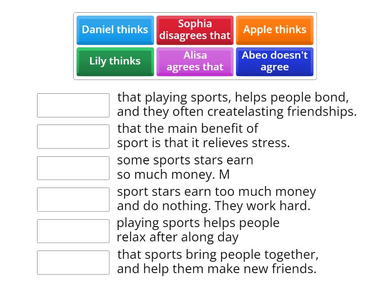 Lily thinks - that sports bring people together, and help them make new friends., Apple thinks - that playing sports, helps people bond, and they often createlasting friendships., Daniel thinks - playing sports helps people relax after along day, Abeo doesn't agree - that the main benefit of sport is that it relieves stress., Alisa agrees that - some sports stars earn so much money. M, Sophia disagrees that - sport stars earn too much money and do nothing. They work hard.,