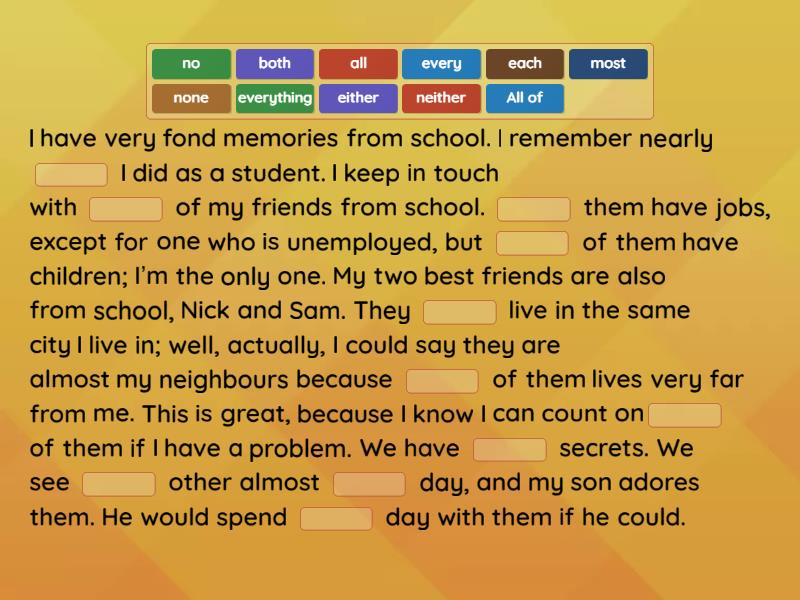 I have very fond memories from school. I remember nearly ____ I did as a student. I keep in touch with ____ of my friends from school. ____ them have jobs, except for one who is unemployed, but ____ of them have children; I’m the only one. My two best friends are also from school, Nick and Sam. They ____ live in the same city I live in; well, actually, I could say they are almost my neighbours because ____ of them lives very far from me. This is great, because I know I can count on____ of them if I have a problem. We have ____ secrets. We see ____ other almost ____ day, and my son adores them. He would spend ____ day with them if he could.
