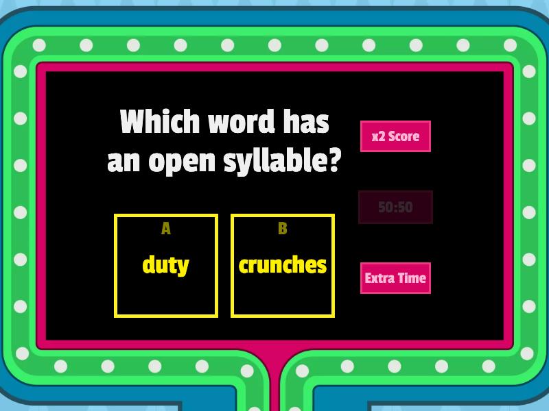 1) Which word has an open syllable? a) duty b) crunches 2) Which word has an open syllable? a) taste b) nasty 3) Which word has an open syllable? a) cape b) shy 4) Which word has an open syllable? a) dizzy b) bring 5) Which word has an open syllable? a) cohost b) mine 6) Which word has an open syllable? a) pretending b) Atlantic 7) Which word has an open syllable? a) grape b) pony 8) Which word has an open syllable? a) flu b) cone 9) Which word has an open syllable? a) hanging b) angry 10) Which word has an open syllable? a) navy b) flunk