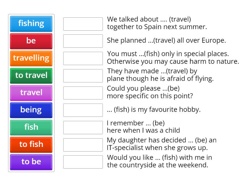 fishing - ... (fish) is my favourite hobby., travelling - We talked about .... (travel) together to Spain next summer., being - I remember ... (be) here when I was a child, to fish - Would you like ... (fish) with me in the countryside at the weekend., fish - You must ...(fish) only in special places. Otherwise you may cause harm to nature., to travel - She planned ...(travel) all over Europe., travel - They have made ...(travel) by plane though he is afraid of flying., be - Could you please ...(be) more specific on this point?, to be - My daughter has decided ... (be) an IT-specialist when she grows up.,