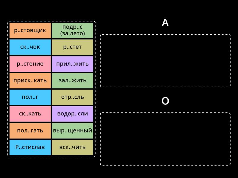 А: р..стет, пол..гать, р..стение, ск..кать, приск..кать, ск..чок, отр..сль, выр..щенный, О: прил..жить , Р..стислав, р..стовщик, подр..с (за лето), зал..жить, вск..чить, водор..сли, пол..г,