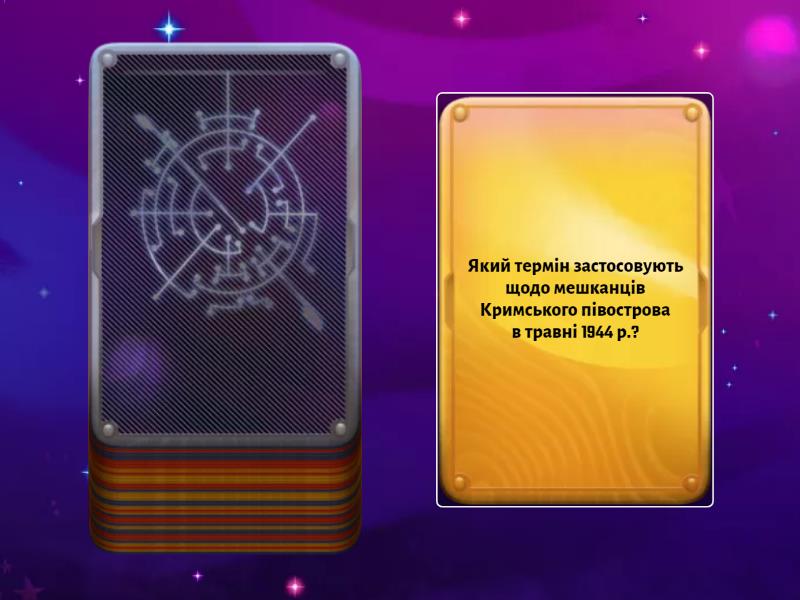 Коли було підписано договір про ненапад між СРСР і Німеччиною терміном на 10 років і таємний протокол до нього?, Яка подія відбулася 01 вересня 1939 року?, Коли радянські війська перейшли польський кордон і зайняли Східну Галичину і Західну Волинь?, Коли Румунія заявила про згоду передати Радянському Союзу Бессарабію і Північну Буковину?, Як називається процес встановлення радянської влади, насадження в усіх сферах радянської моделі?, Що відбулося 22 червня 1941 р.?, Як називався план нападу на СРСР?, Як називається метод ведення війни за допомогою знищення всього корисного, того що може слугувати життєзабезпеченню або існуванню як військ противника, так і цивільного населення — на території, яку може бути зайнято противником?, Як називався нацистський політичний режим на окупованих територіях?, Як називався нацистський план щодо Східної Європи?, Як називається в'язниця для військовополонених і цивільних у воєнний час або у країнах з тоталітарним режимом?, Як в рок війни називали східних робітників, яких спершу добровільно, а згодом примусово відправляли на роботу в Німеччину?, Як називається співробітництво з ворогом, окупантами, урядів або окремих осіб?, Як називається планомірне і організоване знищення єврейського населення в роки Другої світової війни?, Як звали діяча, що брав участь в організації націоналістичного підпілля на Поліссі та Волині та очолив партизанські підрозділи «Поліської Січі»?, Як звали голову проводу ОУН-Б?, Як звали голову проводу ОУН-М?, Як звали одного з авторів Акту проголошення відновлення Української держави у Львові, опісля голова уряду Української держави?, Як звали першого командувача УПА?, Як звали Президента Української Головної Визвольної Ради, утвореної в 1944 році?, Назвіть поняття, яке застосовують щодо національно-визвольного руху на етнічних українських землях у 1920—1950 роках, який мав за мету поновлення української незалежної держави., Коли відбулося проголошення Українськими Національними зборами у Львові з ініціативи ОУН-б Акту відновлення Української держави?, Яка подія відбулася 14 жовтня 1942 р.?, Як називалася підпільна збройна формація, створена на Поліссі (Північна Україна) влітку 1941 року?, Як називалися групи, створені ОУН («мельниківцями») та ОУНР («бандерівцями») з метою організації зі свідомих українців на українських землях органів місцевого самоуправління під час Другої Світової війни?, Хто такі "бандерівці"?, Коли розпочалося звільнення території України від нацистів та їхніх союзників?, Яку умовну назву застосовують щодо піхотних підрозділів Червоної Армії, які були сформовані з цивільного населення окупованих територій після їх звільнення?, Що відбулося 6 листопада 1943 р.?, Коли відбулася Корсунь-Шевченківська операція?, Який термін застосовують щодо мешканців Кримського півострова в травні 1944 р.?, Коли відбулося завершення вигнання німецьких військ та їхніх союзників з території України?, Як звали найрезультативнішого аса у авіації Антигітлерівської коаліції за весь час Другої світової війни?, Як звали лейтенанта Червоної Армії, що встановив прапор совка на даху німецького Рейхстагу, Як звали льотчика-аса, національного героя кримськотатарського народу?, Як звали активного учасника руху опору на теренах Франції упродовж Другої світової війни?, Що відбулося 9 травня 1945 р.?, 