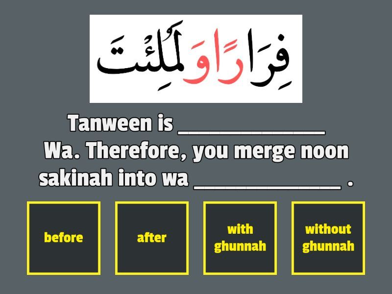 1) Tanween is ______________ Wa. Therefore, you merge noon sakinah into wa ______________ . a) before b) after c) with ghunnah d) without ghunnah 2) Tanween is ______________ laam. Therefore, you merge noon sakinah into laam ______________ . a) after b) before c) with ghunnah d) without ghunnah 3) Tanween is ______________ Wa. Therefore, you merge noon sakinah into wa ______________ . a) before b) after c) with ghunnah d) without ghunnah 4) Tanween is ______________ Wa. Therefore, you merge noon sakinah into wa ______________ . a) before b) after c) with ghunnah d) without ghunnah 5) Noon sakinah is ______________ Ra. Therefore, you merge noon sakinah into ra ______________ . a) after b) before c) with ghunnah d) without ghunnah 6) Tanween is ______________ Wa. Therefore, you merge noon sakinah into wa ______________ . a) before b) after c) with ghunnah d) without ghunnah 7) Tanween is ______________ Wa. Therefore, you merge noon sakinah into wa ______________ . a) after b) before c) without ghunnah d) with ghunnah 8) Tanween is ______________ Wa. Therefore, you merge noon sakinah into wa ______________ . a) before b) after c) with ghunnah d) without ghunnah 9) Tanween is ______________ Wa. Therefore, you merge noon sakinah into wa ______________ . a) after b) before c) with ghunnah d) without ghunnah 10) Tanween is ______________ laam. Therefore, you merge noon sakinah into laam ______________ . a) after b) before c) with ghunnah d) without ghunnah