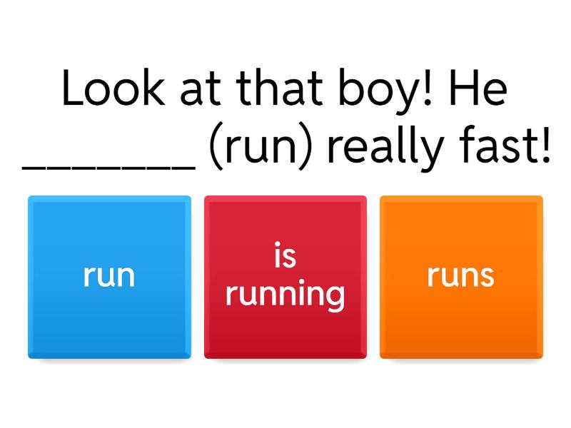 1) Look at that boy! He _______ (run) really fast! a) run b) is running c) runs 2) Tanya and her sister ______ (stay) with us today. a) stay b) is staying c) are staying 3) You can't play on the computer. Dad _____ (use) it! a) is using b) uses c) are use 4) Usually our teachers ______ (not give) us much homework. a) doesn't give b) don't give c) don't gives 5) It _____(be) my bithday today. a) is b) am c) are 6) Leo _________ (listen) to the radio. a) listens b) listen c) is listening 7) I ______ (walk) to school every day. a) 'm walking b) 'm walk c) walk 8) Carla _____ (like) salad, but she ______ (not eat) it in winter. a) like, don't eat b) likes,doesn't eat c) is liking,isn't eating 9) Mum______(talk) on the phone right now. a) is talking b) talks c) are talking