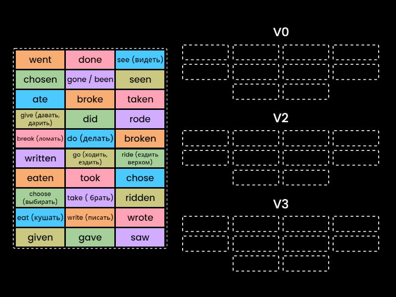 V0: do (делать), go (ходить, ездить), write (писать), take ( брать), see (видеть), ride (ездить верхом), give (давать, дарить), break (ломать), choose (выбирать), eat (кушать), V2: did, went, wrote, took, saw, rode, gave, broke, chose, ate, V3: done, gone / been, written, taken, seen, ridden, given, broken, chosen, eaten,