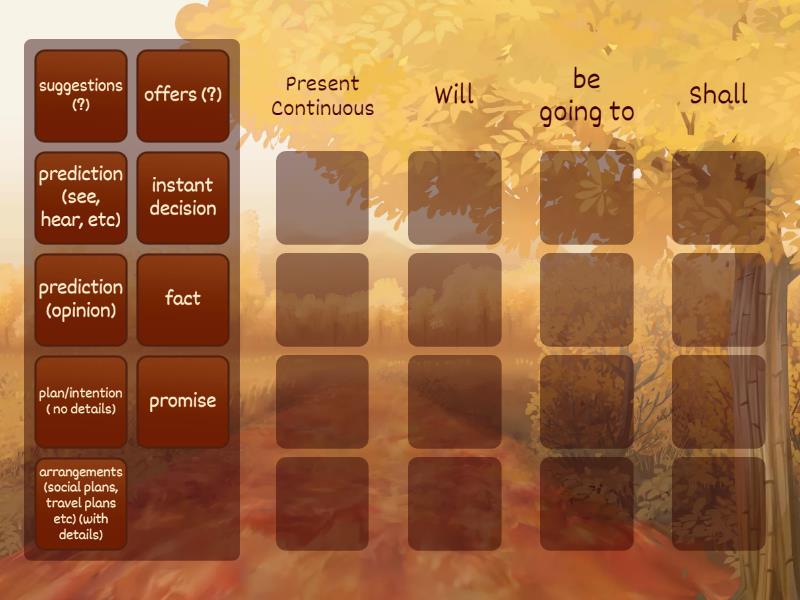 Present Continuous: arrangements (social plans, travel plans etc) (with details), Will: promise, instant decision, fact, prediction (opinion), be going to: plan/intention ( no details), prediction (see, hear, etc), Shall: offers (?), suggestions (?),