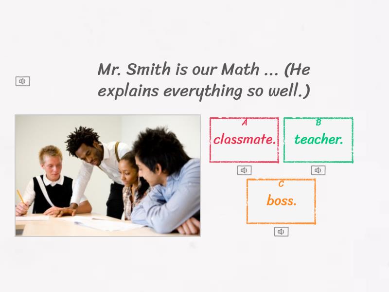 1) Bruno is my ... a) classmate. b) colleague. c) neighbor. 2) Keiko and Jack are my ... (We work in the same department.) a) classmates. b) colleagues. c) bosses. 3) Patricia is my ... (We live right next to each other.) a) colleague. b) boss. c) neighbor. 4) Janice is my ... (I work for her.) a) colleague. b) neighbor. c) boss. 5) Mr. Smith is our Math ... (He explains everything so well.) a) boss. b) classmate. c) teacher. 6) Jan is my best ... (We know each other since we were little.) a) classmate b) girlfriend c) friend