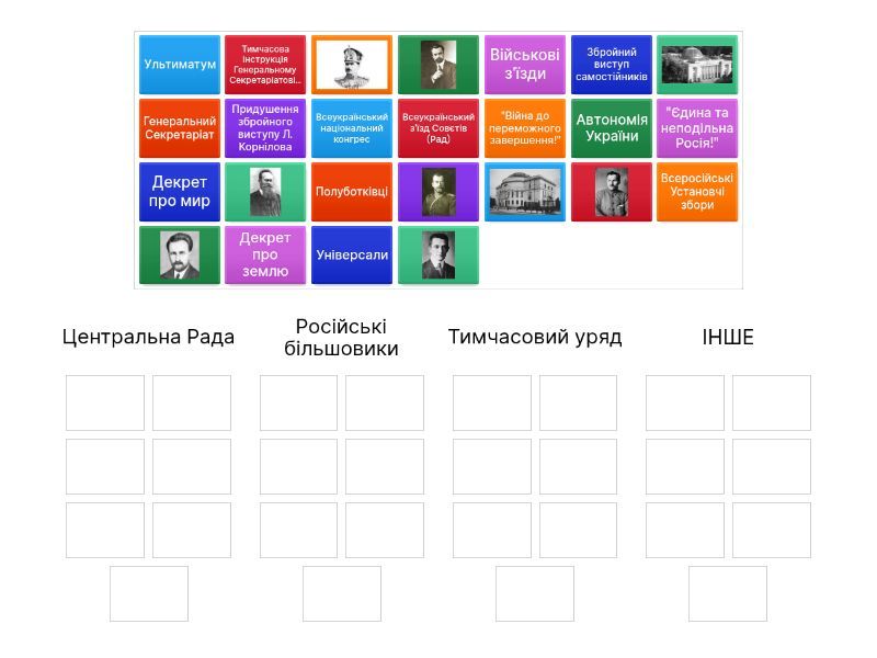 Центральна Рада: Універсали, , , Всеукраїнський національний конгрес, , Автономія України, Генеральний Секретаріат, Російські більшовики: , Всеукраїнський з'їзд Совєтів (Рад), Декрет про мир, Декрет про землю, , Ультиматум, , Тимчасовий уряд: "Війна до переможного завершення!", Всеросійські Установчі збори, Тимчасова інструкція Генеральному Секретаріатові..., , Придушення збройного виступу Л. Корнілова, ІНШЕ: Полуботківці, Військові з'їзди, , Збройний виступ самостійників, , "Єдина та неподільна Росія!",