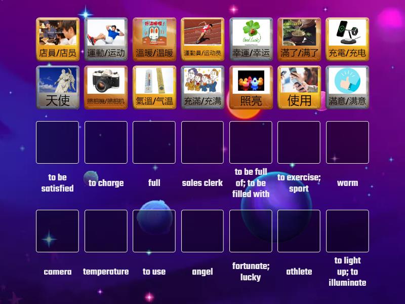 照亮 - to light up; to illuminate, 照相機/照相机 - camera, 溫暖/温暖 - warm, 氣溫/气温 - temperature, 使用 - to use, 天使 - angel, 運動/运动 - to exercise; sport, 幸運/幸运 - fortunate; lucky, 運動員/运动员 - athlete, 店員/店员 - sales clerk, 充滿/充满 - to be full of; to be filled with, 充電/充电 - to charge, 滿了/满了 - full, 滿意/满意 - to be satisfied,
