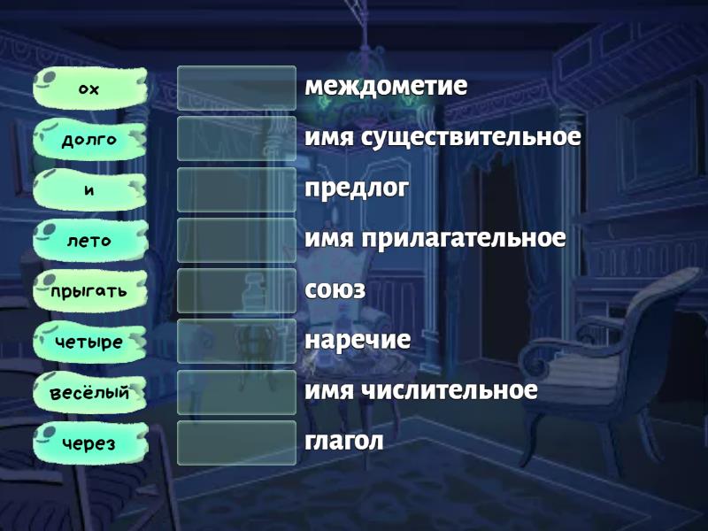 лето - имя существительное, весёлый - имя прилагательное, прыгать - глагол, долго - наречие, четыре - имя числительное, ох - междометие, через - предлог, и - союз,