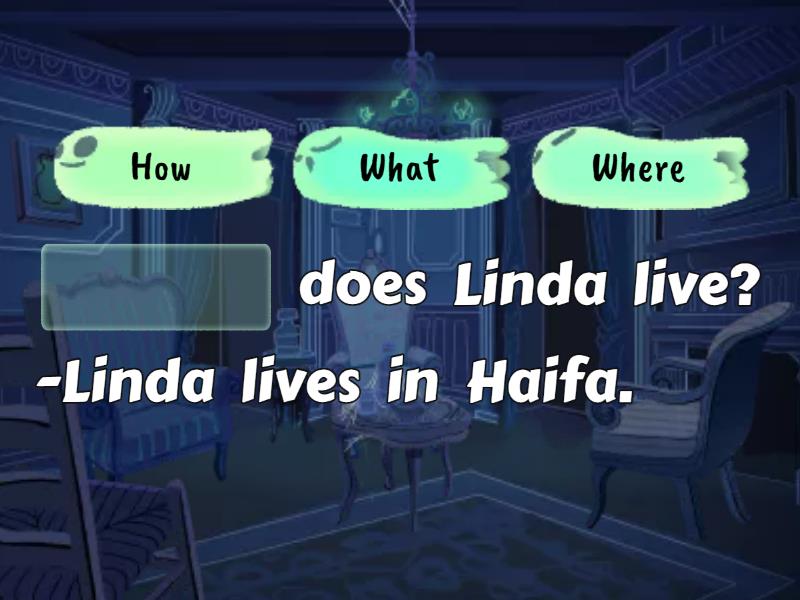 ____ does Linda live? -Linda lives in Haifa. ____ do you eat for breakfast? -I eat eggs and toast for breakfast. ____ is Kate sad? -She is sad because she lost her doll. ____ do you visit your cousins? -I visit my cousins on holidays. ____ do you get to school? -My mother takes me to school. ____ are your twin sisters? -They are two years old. ____ does Dan play tennis? -He plays tennis twice a week. ____ does this book cost? -It costs 50 shekels. ____ pupils are in your class? -We are 30 pupils in my class.