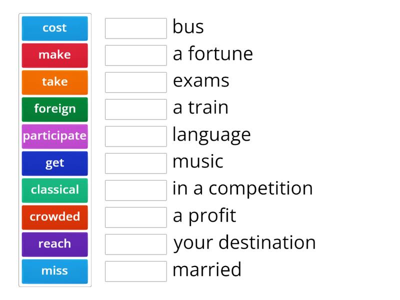 reach - your destination, get - married, miss - a train, cost - a fortune, make - a profit, take - exams, crowded - bus, foreign - language, classical - music, participate - in a competition,