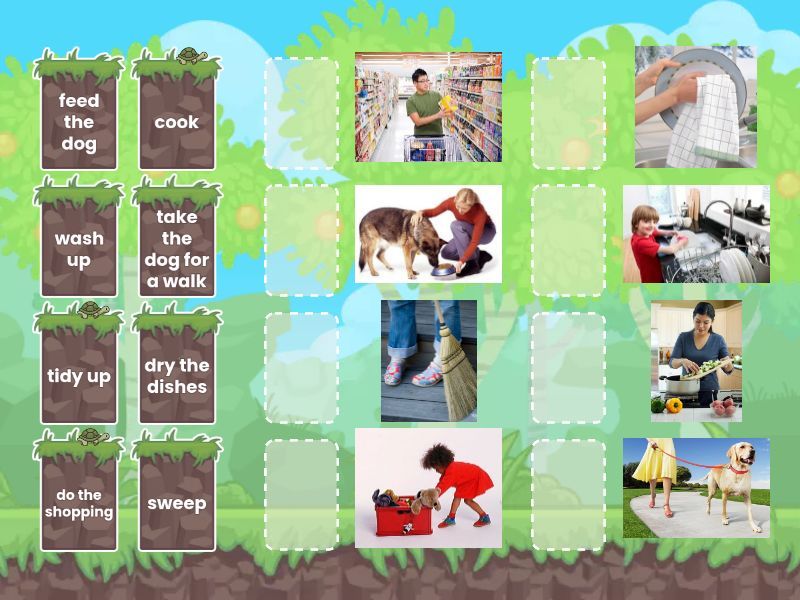 tidy up, do the shopping, take the dog for a walk, wash up, sweep, cook, dry the dishes, feed the dog,