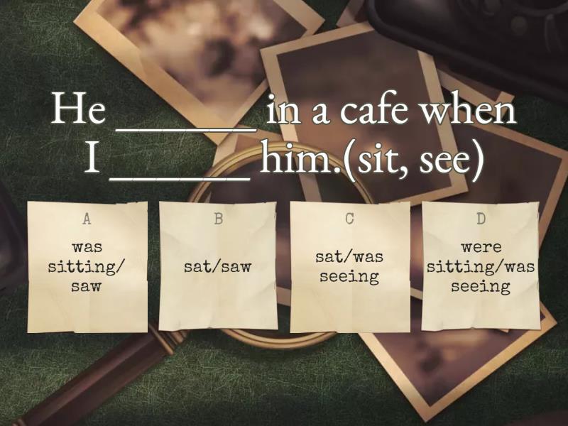 1) He ______ in a cafe when I ______ him.(sit, see) a) was sitting/ saw b) sat/saw c) sat/was seeing d) were sitting/was seeing 2) When I ______, the sun ______.(go out, shine ) a) went out/shone b) was going out/shone c) was going out/was shining d) went out/ was shining 3) The boy ______ while he ______.(fall down, run) a) fell down/ran b) was falling down/was running c) fell down/was running d) was falling down/ran 4) When the war ______ we ______ in London.(begin , live) a) began/lived b) was beginning/was living c) began/were living d) was beginning/lived 5) The light ______ while I ______ tea. (go out, have) a) went out/had b) went out/was having c) was going out/was having d) was going out/had 6) My friends ______ when I ______ into the room.(sing, come) a) were singing/come b) were singing/was coming c) sang/came d) were singing/came 7) While you ______the piano, I ______ a letter.(play, write) a) were playing/wrote b) were playing/was writing c) played/wrote d) played/was writing 8) He ______ his dinner when I ______ him. (eat, call) a) ate/called b) ate/was calling c) was eating/was calling d) was eating/called 9) She ______at school when the earthquake ___________ . (study, happen) a) study/happen b) was studying/was happenning c) was studying/happened d) studying/happened 10) When the phone _____ I ______ a bath.(ring, have) a) rang/had b) was ringing/was having c) was ringing/had d) rang/was having 11) They _______ when they ___________ an avalanche. (ski, see) a) skied/seed b) was skiing / saw c) skied/ were seeing d) were skiing/ saw 12) One day, Colin _______ his breakfast while he _______ to a programme on the radio about the fight against plastic. (eat, listen) a) ate/ listened b) ate / was listening c) was eating/ was listening d) was eating /listened