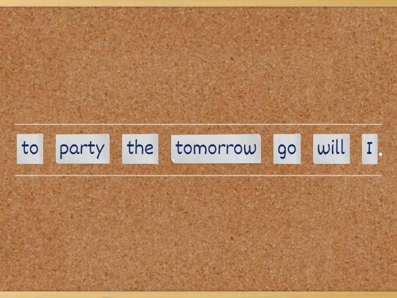 I will go to the party tomorrow. , I will write a letter to Santa next week. , I will give you a present next month. , He will watch a cartoon tomorrow. , We will go to the shop next week. , They will play tennis next week., I will visit my granny tomorrow. , She will play a new game tomorrow. , I will read a new book tomorrow. , I will have holidays next month. ,