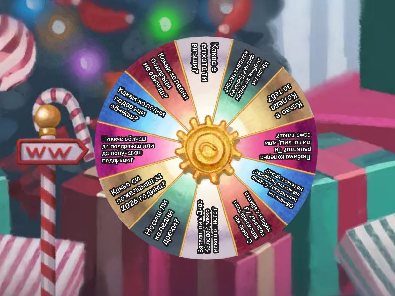 1) Какви коледни подаръци обичаш? 2) Какви коледни подаръци не обичаш? 3) Каква е елхата ти вкъщи? 4) Имаш ли любим коледен филм? Любима коледна песен? 5) Какво е Коледа за теб? 6) Любима коледна рецепта? Ти ли готвиш, или само ядеш? 7) Обичаш ли шампанско? С какво ще кажеш 'наздраве' на Нова година? 8) С какво ще запомниш тази година? / 3 хубави събития 9) Вярваш ли в Дядо Коледа? Какво искаш от него? 10) Носиш ли коледни дрехи? 11) Какво си пожелаваш за 2026 година? 12) Повече обичаш да подаряваш или да получаваш подаръци?