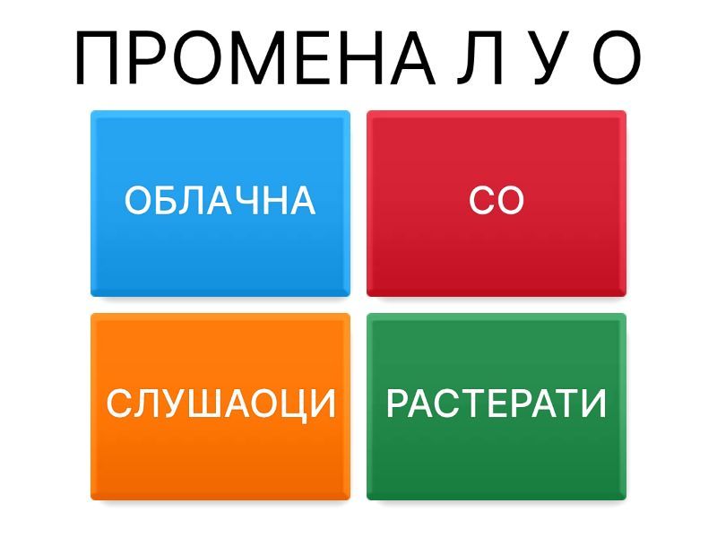 1) ПРОМЕНА Л У О a) ОБЛАЧНА b) СО c) СЛУШАОЦИ d) РАСТЕРАТИ 2) ЈОТОВАЊЕ, ЈЕДНАЧЕЊЕ СУГЛАСНИКА ПО МЕСТУ ИЗГОВОРА a) МАШЋУ b) РАШЧЕШЉАТИ c) ПАЖЊА d) ГОЗБА 3) ПРОМЕНА Л У О, НЕПОСТОЈАНО А a) ПАЖЊА b) БЕШУМАН c) СЛУШАОЦИ d) СО 4) ГУБЉЕЊЕ СУГЛАСНИКА, ЈЕДНАЧЕЊЕ СУГЛАСНИКА ПО ЗВУЧНОСТИ, a) БРЖИ b) ПАЖЊА c) ГОЗБА d) ОБЛАЧНА 5) ПАЛАТАЛИЗАЦИЈА a) МАШЋУ b) СТАРЦИ c) ПРАШАК d) РАСТЕРАТИ 6) ЈЕДНАЧЕЊЕ СУГЛАСНИКА ПО МЕСТУ ИЗГОВОРА a) ПАЖЊА b) СТАРЦИ c) СЛУШАОЦИ d) ОБЛАЧНА 7) ГУБЉЕЊЕ СУГЛАСНИКА a) СЛУШАОЦИ b) РАШЧЕШЉАТИ c) РУСКИ d) ОБЛАЧНА 8) ЈОТОВАЊЕ a) СТАРЦИ b) ЗАДАЦИ c) ПАЖЊА d) БРЖИ 9) НЕПОСТОЈАНО А a) СТАРЦИ b) ПРАШАК c) БЕШУМАН d) ОБЛАЧНА 10) НЕПОСТОЈАНО А, ПАЛАТАЛИЗАЦИЈА a) ОБЛАЧНА b) РУСКИ c) КРЧАЗИ d) БЕШУМАН 11) ЈЕДНАЧЕЊЕ СУГЛАСНИКА ПО ЗВУЧНОСТИ, ЈЕДНАЧЕЊЕ СУГЛАСНИКА ПО МЕСТУ ИЗГОВОРА a) РАШЧЕШЉАТИ b) ПАЖЊА c) МАШЋУ d) БЕШУМАН 12) JЕДНАЧЕЊЕ СУГЛАСИКА ПО ЗВУЧНОСТИ, ЈЕДНАЧЕЊЕ СУГЛАСНИКА ПО МЕСТУ ИЗГОВОРА, ГУБЉЕЊЕ СУГЛАСНИКА a) ЗАДАЦИ b) РУСКИ c) СЛУШАОЦИ d) БЕШУМАН 13) СИБИЛАРИЗАЦИЈА, НЕПОСТОЈАНО А, ГУБЉЕЊЕ СУГЛАСНИКА a) СЛУШАОЦИ b) БРЖИ c) ЗАДАЦИ d) КРЧАЗИ 14) СИБИЛАРИЗАЦИЈА a) РАШЧЕШЉАТИ b) КРЧАЗИ c) МАШЋУ d) ЗАДАЦИ 15) ЈЕДНАЧЕЊЕ СУГЛАСНИКА ПО ЗВУЧНОСТИ a) РАСТЕРАТИ b) ОБЛАЧНА c) ГОЗБА d) КРЧАЗИ