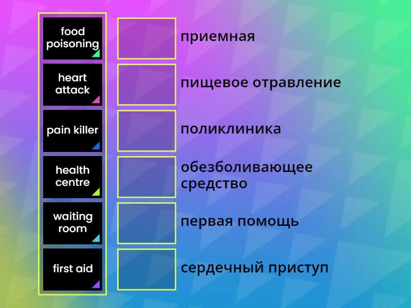 pain killer - обезболивающее средство, first aid - первая помощь, waiting room - приемная, heart attack - сердечный приступ, health centre - поликлиника, food poisoning - пищевое отравление,