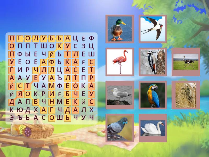 сова, ласточка, фламинго, попугай, чайка, страус, лебедь, дятел, голубь, утка,