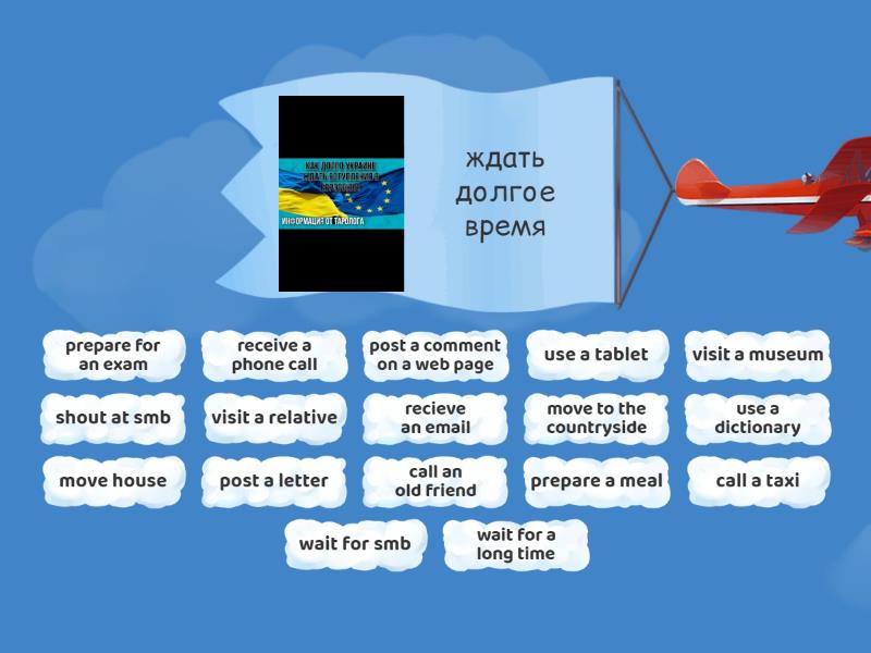 wait for a long time - ждать долгое время, wait for smb - ждать чего-то, post a letter - отправить письмо, post a comment on a web page - оставить комментарий, move house - переехать, move to the countryside - переехать загород, visit a museum - пойти в музей, visit a relative - посетить родственника, shout at smb - накричать на кого-то, prepare a meal - приготовить обед, prepare for an exam - готовиться к экзамену, recieve an email - получить эл. письмо, receive a phone call - получить звонок, call a taxi - вызвать такси, call an old friend - позвать старого друга, use a dictionary - использовать словарь, use a tablet - использовать планшет,