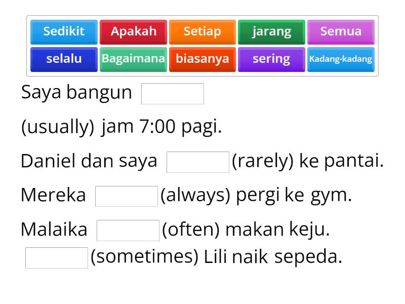 Saya bangun ____ (usually) jam 7:00 pagi. Daniel dan saya ____(rarely) ke pantai. Mereka ____(always) pergi ke gym. Malaika ____(often) makan keju. ____(sometimes) Lili naik sepeda. Kami ____(always) berhimpun di balai kerajaan. Kalian ____(often) pergi ke pasar. Bill ____(sometimes) bersepeda ke rumah. Ibu ____(usually) memasak ayam goreng. Nathan ____(rarely) naik motor.