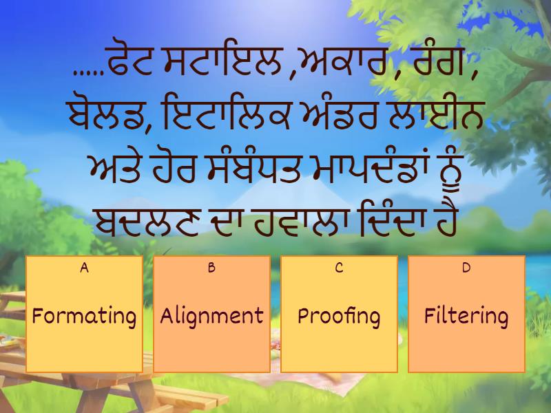1) .....ਫੋਟ ਸਟਾਇਲ ,ਅਕਾਰ , ਰੰਗ , ਬੋਲਡ, ਇਟਾਲਿਕ ਅੰਡਰ ਲਾਈਨ ਅਤੇ ਹੋਰ ਸੰਬੰਧਤ ਮਾਪਦੰਡਾਂ ਨੂੰ ਬਦਲਣ ਦਾ ਹਵਾਲਾ ਦਿੰਦਾ ਹੈ a) Formating b) Alignment c) Proofing d) Filtering 2) ....... ਇਲੈਕਟ੍ਰਾਨਿਕ ਸਪ੍ਰੈਡਸ਼ਟ ਸਾਫਟਵੇਅਰ ਹੈ, ਜੋਂ ਸਵੈਚਾਲਤ ਗਣਨਾ ਲਈ ਵਰਤਿਆ ਜਾਂਦਾ ਹੈ a) M.S WINDOW b) M S.Excel c) M.S.POWERPOINT d) M.S.WORD 3) .......ਵਰਡ ਪ੍ਰੋਸੈਸਰ ਸਾਫਟਵੇਅਰ ਹੈ a) M.S.WINDOW b) M.S.EXCEL c) M.S.POWERPOINT d) M S WORD 4) ਵਰਡ ਵਿਚ ...... ਆਪਸ਼ਨ ਪੇਜ ਦੇ ਢਾਂਚੇ ਅਤੇ ਰੇਅ ਆਊਟ ਨੂੰ ਬਦਲਦਾ ਹੈ। a) Format b) Print and print preview c) Page setup d) Proofing 5) ਸਪੇਲਿੰਗ ਅਤੇ ਗਰਾਮਰ ਦੀ ਜਾਂਚ ਕਰਨ ਲਈ....... ਕੀਅ ਵਰਤੀ ਜਾਂਦੀ ਹੈ a) Ctrl+F7 b) Alt +F7 c) F7 d) Shift+F7 6) ......ਚਿੰਨ੍ਹ ਐਕਸਲ ਗਣਨਾ ਵਿੱਚ ਕਿਸੇ ਵੀ ਫਾਰਮੂਲੇ (ਫੰਕਸ਼ਨ) ਨੂੰ ਸ਼ੁਰੂ ਕਰਨ ਲਈ ਵਰਤਿਆ ਜਾਂਦਾ ਹੈ a) = ਬਰਾਬਰ ਦਾ ਨਿਸ਼ਾਨ b) + ਜਮਾਂ ਦਾ ਨਿਸ਼ਾਨ c) / ਤਕਸੀਮ ਦਾ ਨਿਸ਼ਾਨ d) @ 7) ਪੇਜ ਸੇਂਟਅਪ ਦੇ ਲਈ ੳਰੀਐਂਟੇਸ਼ਨ ਦੇ ਦੋ ਵਿਕਲਪ ........... ਅਤੇ............ ਹਨ a) ਪੋਰਟਰੇਟ ,ਲੈਡਸਕੈਪ b) ਲੈਡਸਕੈਪ,A4 c) ਪੋਰਟਰੇਟ ,A4 d) ਇਹਨਾਂ ਵਿੱਚੋਂ ਕੋਈ ਨਹੀਂ 8) ਜੇ ਕਰਸਰ ਨੂੰ ਫਾਈਲ ਦੇ ਅਖੀਰ ਵਿੱਚ ਰੱਖਿਆ ਗਿਆ ਹੈ ਟੈਕਸਟ ਨੂੰ ਮਿਟਾਉਣ ਲਈ ......... ਬਟਨ ਦਬਾਇਆ ਜਾਂਦਾ ਹੈ a) BACKSPACE KEY b) DELETE KEY c) NUM LOCK KEY d) CAPSLOCK KEY 9) ......... ਅਤੇ ........ ਫੰਕਸ਼ਨ ਸੀਮਾ ਵਿੱਚ ਘੱਟ ਅਤੇ ਵੱਧ ਮੁੱਲ ਲਭਣ ਲਈ ਵਰਤੇ ਜਾਂਦੇ ਹਨ a) Min and Max b) - and + c) FIND AND REPLACE d) Go and find 10) ਫਿਲਟਰ ਵਿਕਲਪ ਐਕਸਲ ਦੀ ........ ਟੈਬ ਵਿੱਚ ਉਪਲਬਧ ਹੈ a) Insert b) Data c) View d) Help