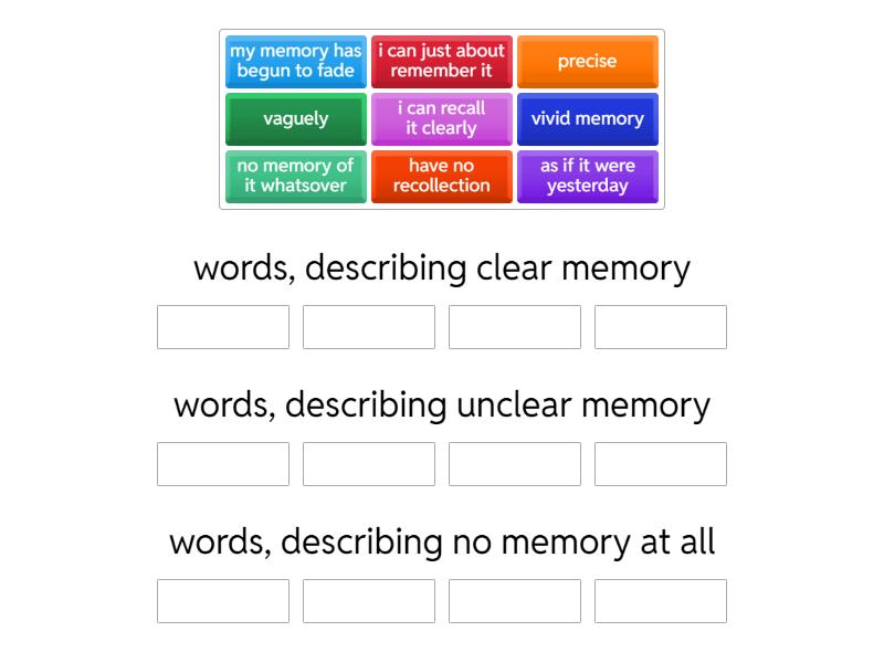 words, describing clear memory: vivid memory, precise, as if it were yesterday, i can recall it clearly, words, describing unclear memory: vaguely, i can just about remember it, my memory has begun to fade, words, describing no memory at all: no memory of it whatsover, have no recollection,