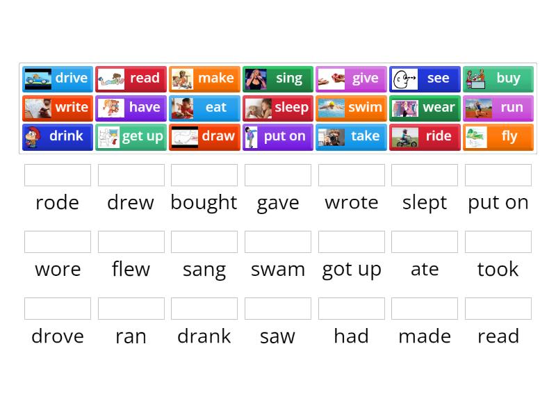 draw - drew, drink - drank, drive - drove, eat - ate, fly - flew, get up - got up, see - saw, have - had, give - gave, run - ran, ride - rode, read - read, put on - put on, make - made, sing - sang, sleep - slept, swim - swam, take - took, buy - bought, wear - wore, write - wrote,