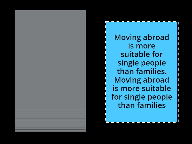 Moving abroad is more suitable for single people than families. Moving abroad is more suitable for single people than families , If you travel to another country alone, you’ll make new friends more quickly., People in warmer climates tend to be more open., If you live in a country where you don’t speak the language, life is more difficult., The older you get, the less adventurous you become., Children who travel around the world with their family for a year become more knowledgeable than those who spend the year at school., Moving away from your parents when you are young makes you happier., A weekend away is just as good as a two-week holiday., Backpacking around the world is more interesting than staying in five-star hotels., As many people emigrate from my country as immigrate to my country., The more time you spend living in a country, the more you forget your own culture., It’s better to move out of a city if you start a family..