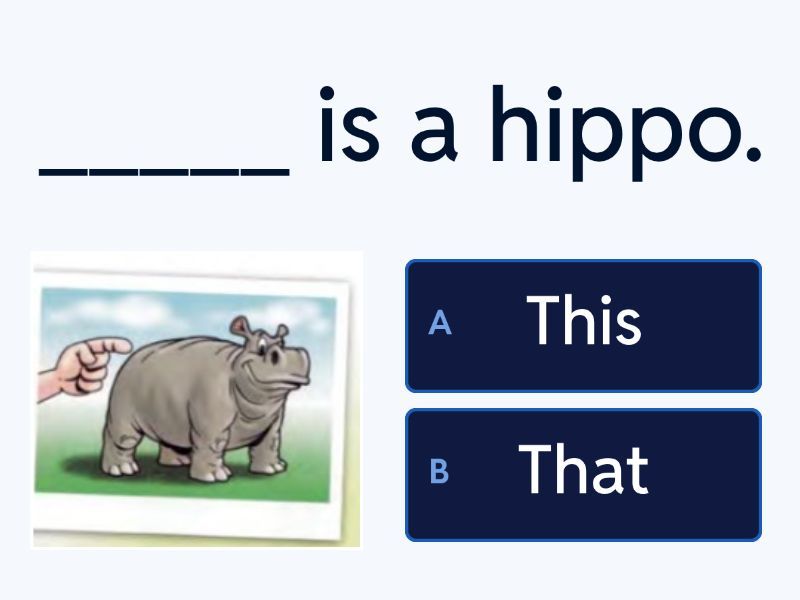 1) _____ is a hippo. a) This b) That 2) ______ is a giraffe. a) This b) That 3) ________ is a tiger. a) This b) That 4) _____ is my classroom a) This b) That 5) ______ is a bookcase a) This b) That 6) _____ is a rubber a) This b) That 7) ________ is a board a) This b) That
